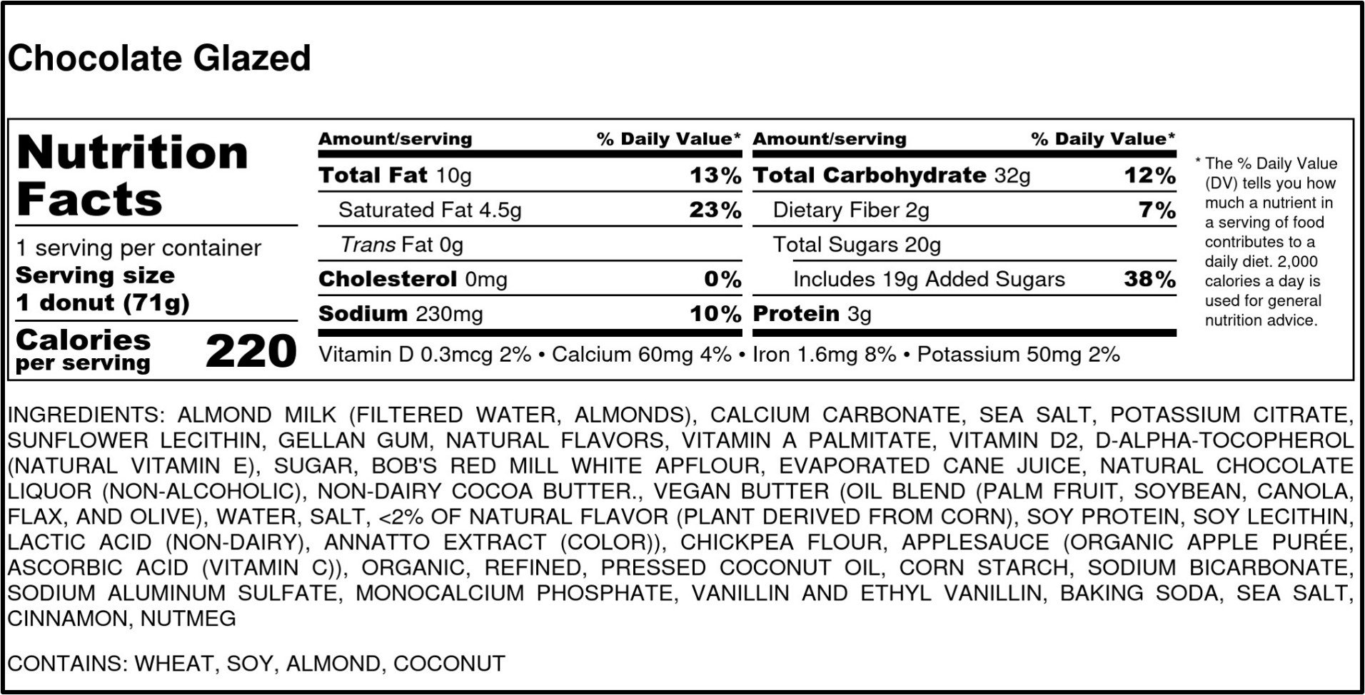 Indulge in the perfect balance of sweet and savory with our delectable vegan donut, crafted with a blend of wholesome, organic ingredients. Made with unbleached organic flour, chickpea flour, and a dash of aromatic organic cinnamon and nutmeg, each bite offers a warm, comforting flavor. Sweetened with organic cane sugar and enriched with a touch of Madagascar pure vanilla extract and unsweetened vanilla almond milk, this donut delivers a melt-in-your-mouth experience. Topped with a rich semi-sweet chocolate glaze and made with a hint of organic virgin coconut oil and vegan butter for an extra layer of decadence, this treat is the ideal guilt-free indulgence. Whether you're enjoying it with your morning coffee or as an afternoon snack, our vegan donut is sure to satisfy your sweet tooth with a savory twist.