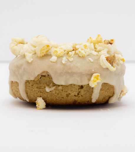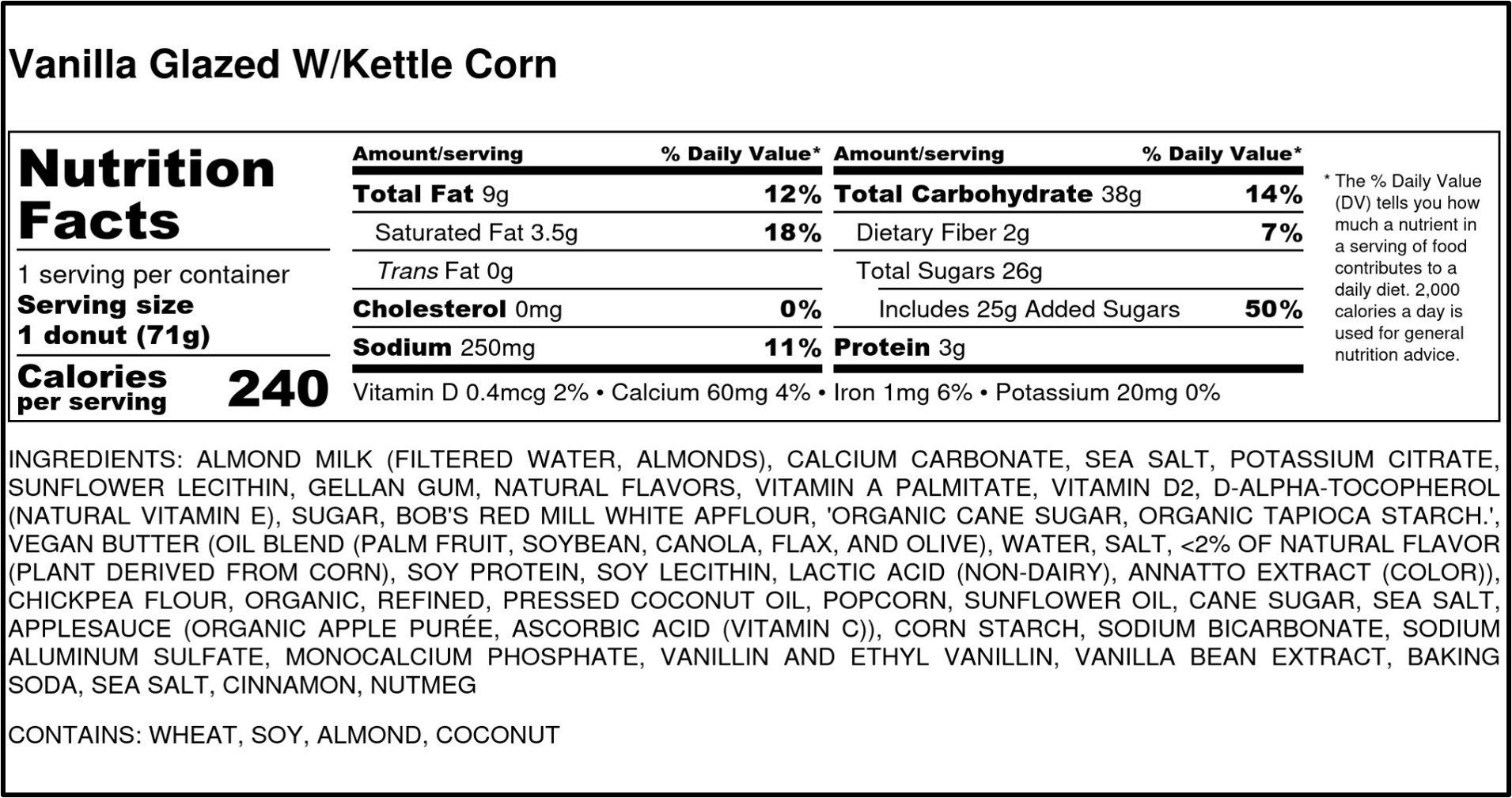 Experience the ultimate in indulgence with our Vanilla Glazed with Kettle Corn Vegan Donut, where savory meets sweet in the most delightful way. Made with a wholesome blend of unbleached organic flour and chickpea flour, this donut is infused with the warm flavors of organic cinnamon and nutmeg. The donut’s light, airy texture is complemented by a rich glaze of Madagascar vanilla and a touch of coconut oil, while the real star is the crunchy, caramelized kettle corn sprinkled on top. The combination of organic cane sugar, applesauce, and vegan butter creates a perfectly balanced sweetness, making each bite an irresistible, satisfying treat. This donut is a perfect harmony of wholesome ingredients and playful, nostalgic flavor.