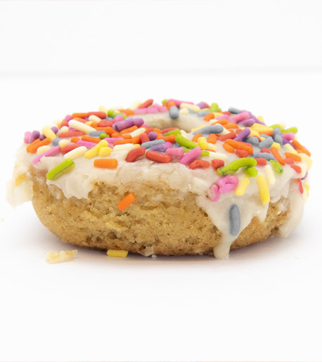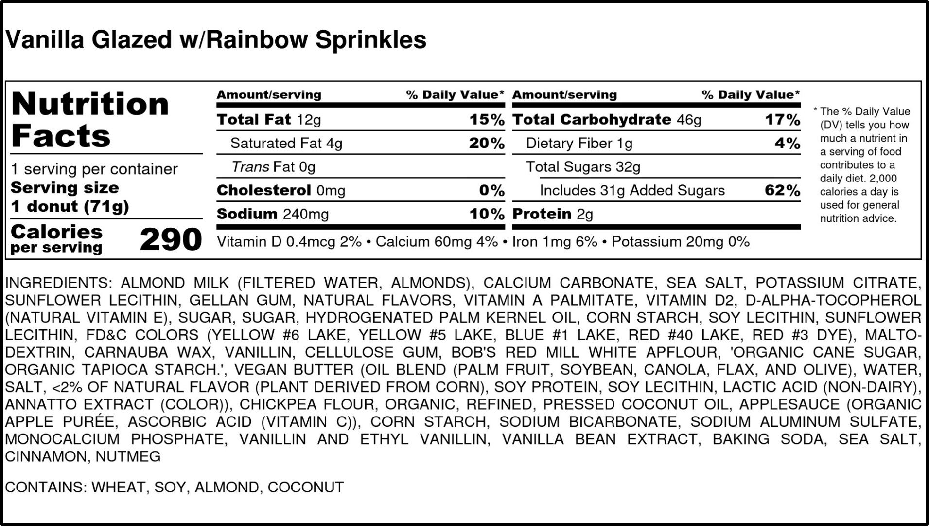 Brighten your day with our Vanilla Glazed with Rainbow Sprinkles Vegan Donut, a vibrant burst of color and flavor that’s sure to bring a smile to your face. Made with unbleached organic flour and chickpea flour, this fluffy donut is delicately spiced with organic cinnamon and nutmeg, creating a comforting base. The smooth, creamy glaze of Madagascar vanilla and organic coconut oil is the perfect canvas for a playful sprinkle of rainbow vegan sprinkles, adding a fun pop of color and sweetness to every bite. With a balanced sweetness from organic cane sugar and applesauce, plus the richness of vegan butter, this donut is a joyful treat that not only delights your taste buds but brightens your entire day with its cheerful, colorful finish.